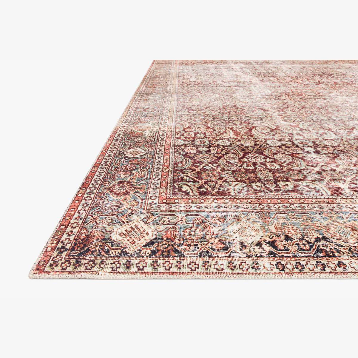 The Anouk Rug is traditional and timeless, with a beautiful and bright distressed design that captures the spirit of an old-world rug. This palette incorporates shades of maroon, blush, and rust with a hint of deep blue. |