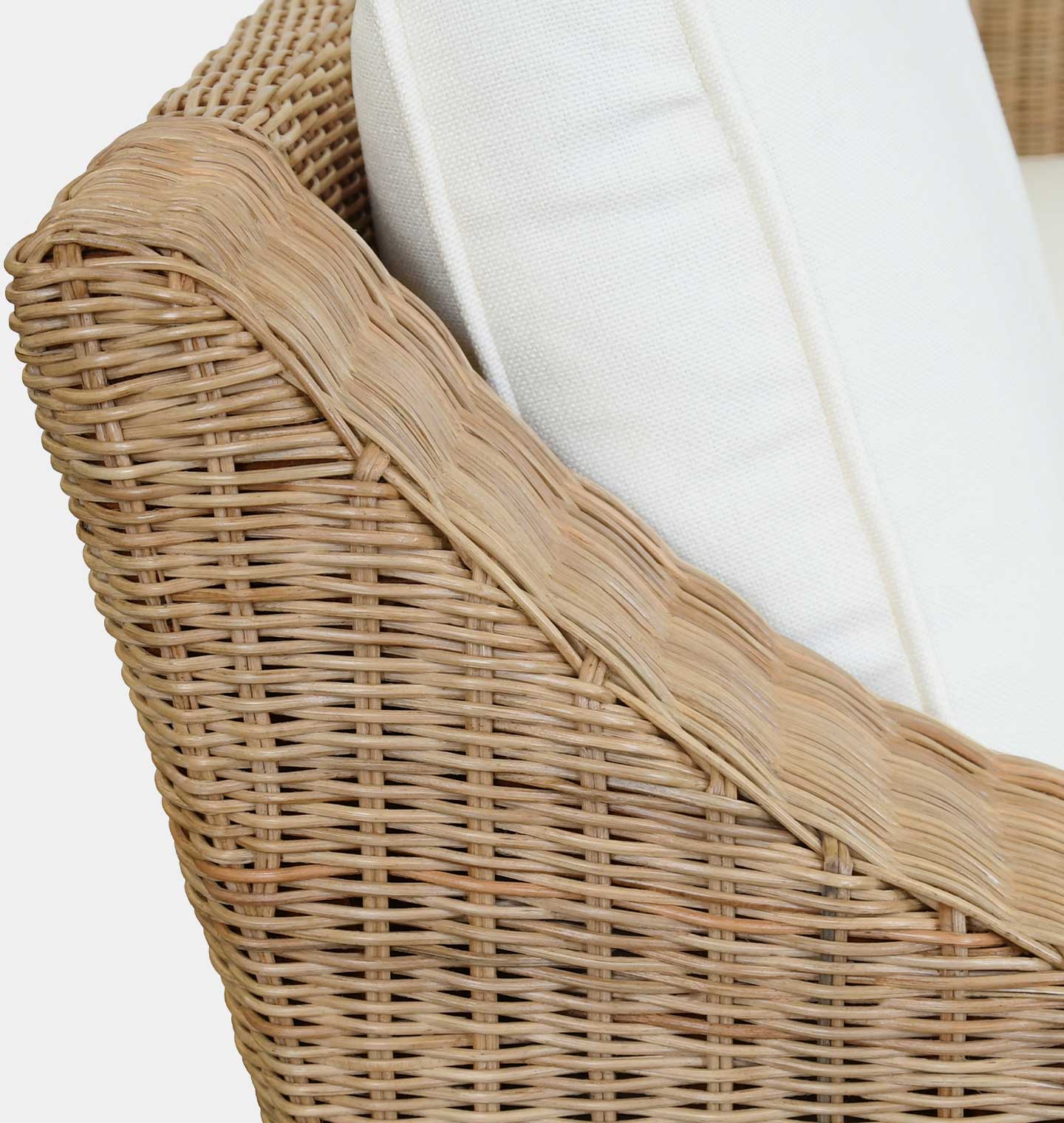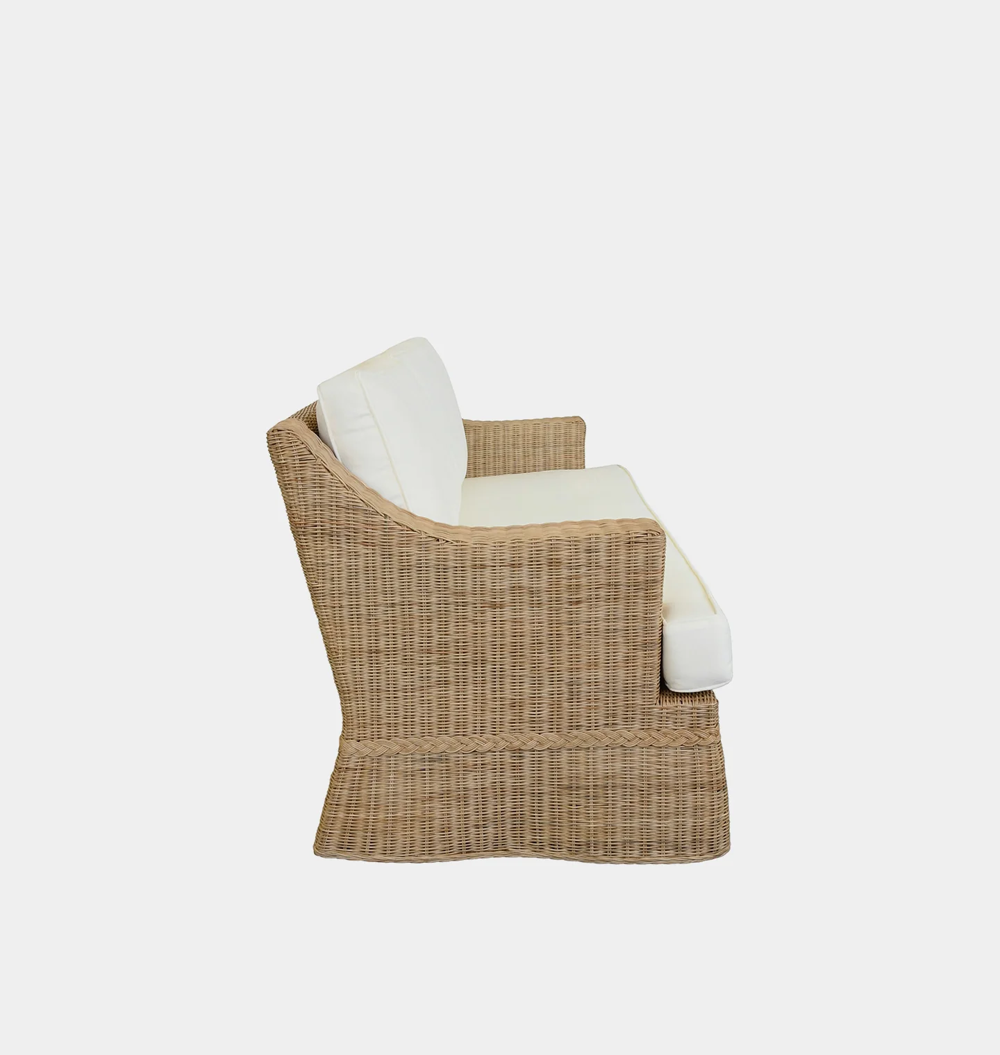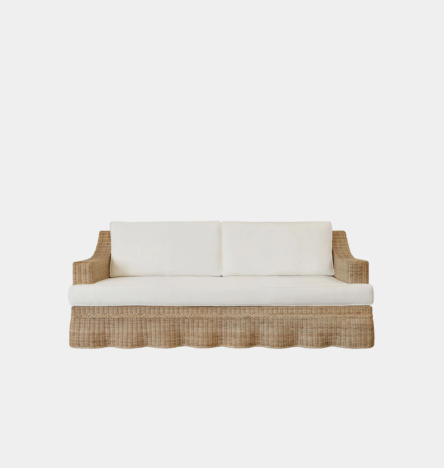 The Kes Sofa combines the timeless sophistication of a Lawson style sofa with the organic beauty of natural rattan and a delicate scalloped skirt. Its luxurious ivory linen cushions provide unparalleled comfort and elegance. Elevate your living space with this exclusive and tasteful piece. |