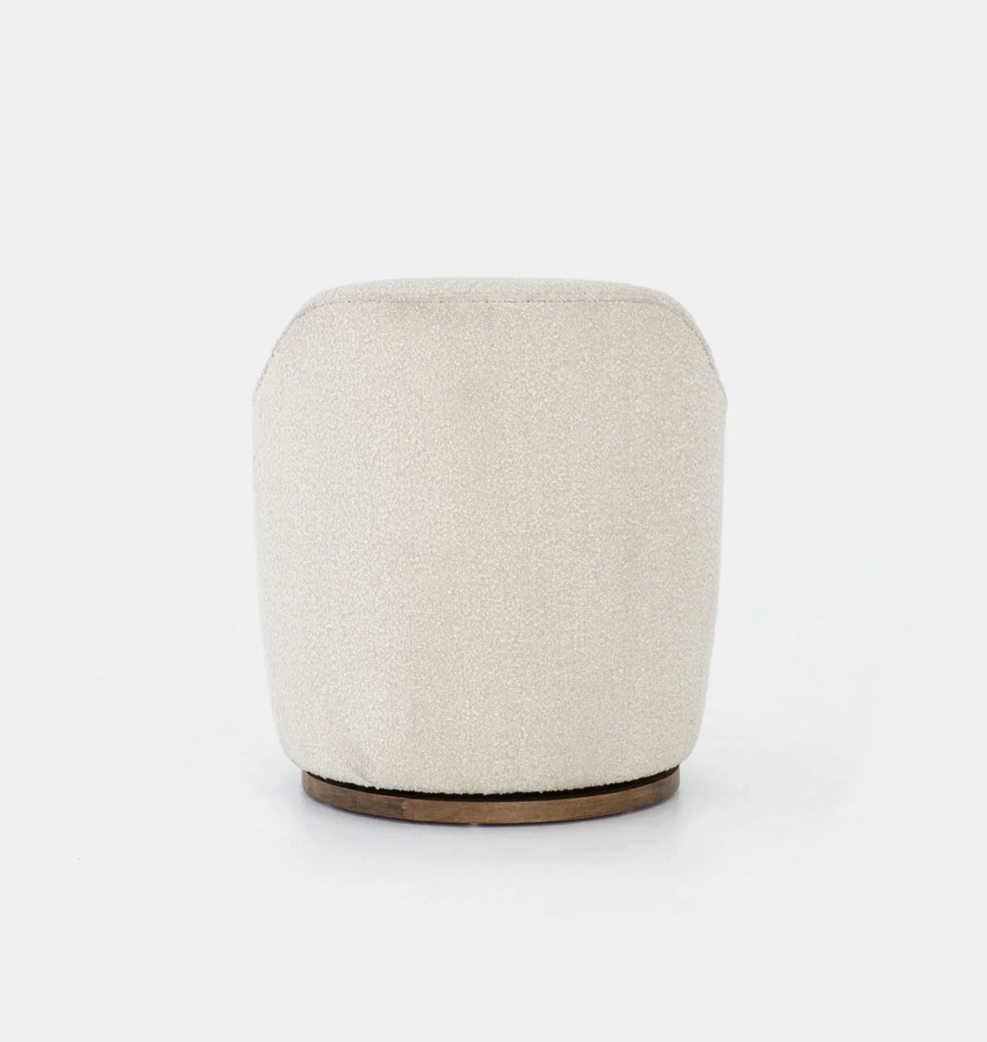Intriguing while inviting. Drum-style seating is upholstered in a soothing and textural off-white bouclé. A swivel base of natural parawood places a fresh spin on a feminine form. |